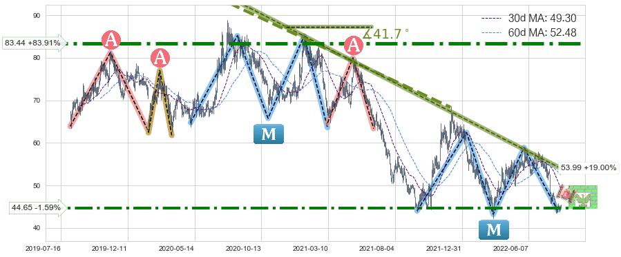 ♘ 阻力价格位44.65,可信任强度74.41%,距离最后交易2022-08-12形成的收盘价格45.37相差 -1.59%