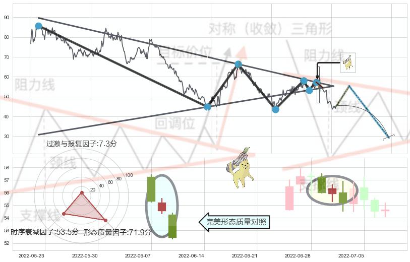 ➢ 【卖1】: 激进型 卖点→(2022-07-12: 54.40 )形成突破下降【对称】三角形整理【整理】形态
