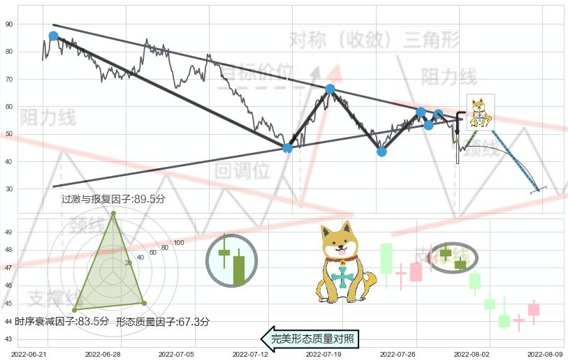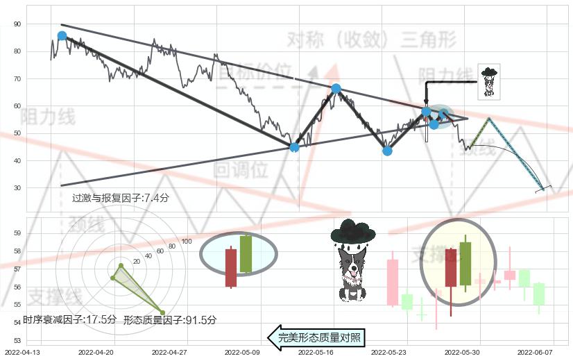➢ 看跌(高位倒锤头)流星线 🔜 下降对称三角整理支撑破位转换阻力下跌 综合量化分数:42.08 【偏空】