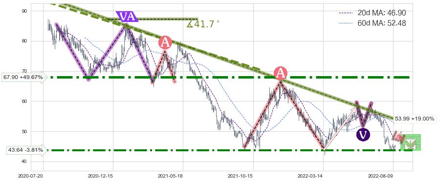 ♘ 在最后的下跌阶段2020-07-29至2022-08-12,存在 持续未破位的阻力位 ,阻力价格53.99,可信任强度88.37%,其距离最后价格45.37相差 +19.00%