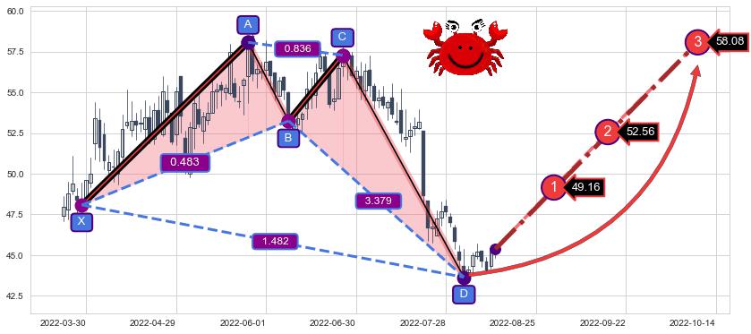 ➢ 谐波螃蟹:c下跌到达d:猜想拉升 → 上涨 →【拐点】强支撑临近 → 大趋势均值回复