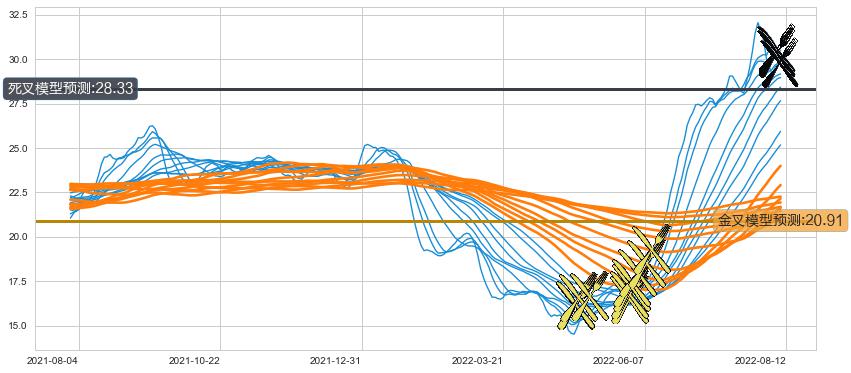 ➢ 21小时均线于(2022-08-11: 29.75)形成【死叉】基于【死叉历史模型】预测死叉后最低波谷价格: 27.66, 死叉后最低价格29.20,尚未达到预测最低波谷价格, 预期继续下跌