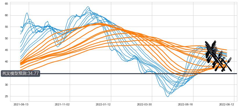 ➢ 80小时均线于(2022-08-11: 38.49)形成【死叉】基于【死叉历史模型】预测死叉后最低波谷价格: 32.04, 死叉后最低价格38.54,已经下跌超出预测最低波谷价格, 预期反弹