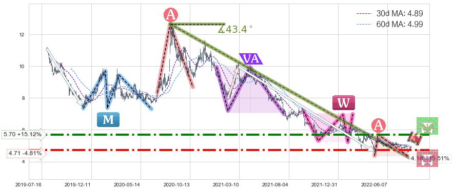 ➢ 【仅预测突破】最后价格:4.95与预测突破价格:4.62→【空间较大】后续最小【整理】第一目标价格→(2022-10-05: 3.738 )