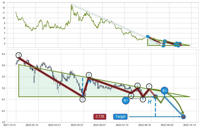 ➣ 【未确认突破,预测即将形成突破】下降三角形整理起点:2022-01-06, 预测突破点:2022-08-23,形态共153交易日
