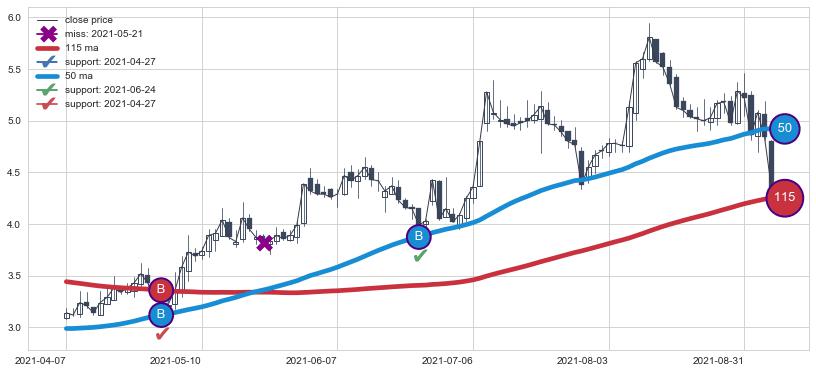 ➢ 最优均线组合共正确确认支撑阻力信号9处,正确确认率 69.23%