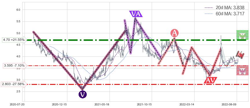 ♘ 阻力价格位4.70,可信任强度96.49%,距离最后交易2022-08-12形成的收盘价格3.870相差 +21.55%