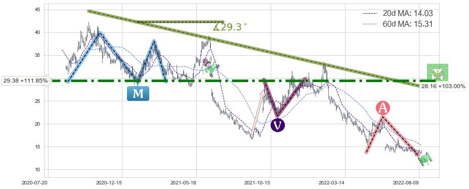 从2020-10-13至2022-08-12,共包含449个交易日,阶段股价下跌-80.23%,阶段股价变动位移路程比: 1 : 13,下跌趋势角度: 29.3,2021-06-16向↘︎形成缺口,跳空下跌-29.02%˚