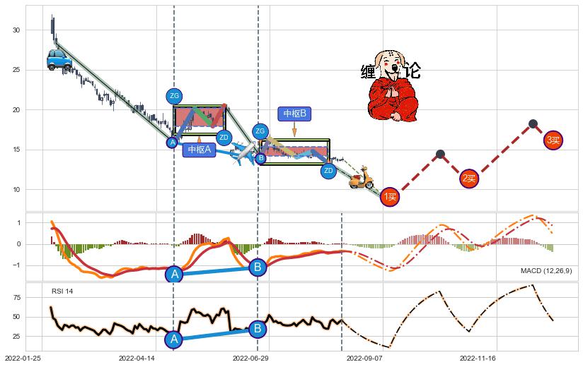 ➢ 【中枢B】:2022-06-23-2022-08-04,中枢由5笔构成,共31交易日, ZG=14.79, ZD=14.15