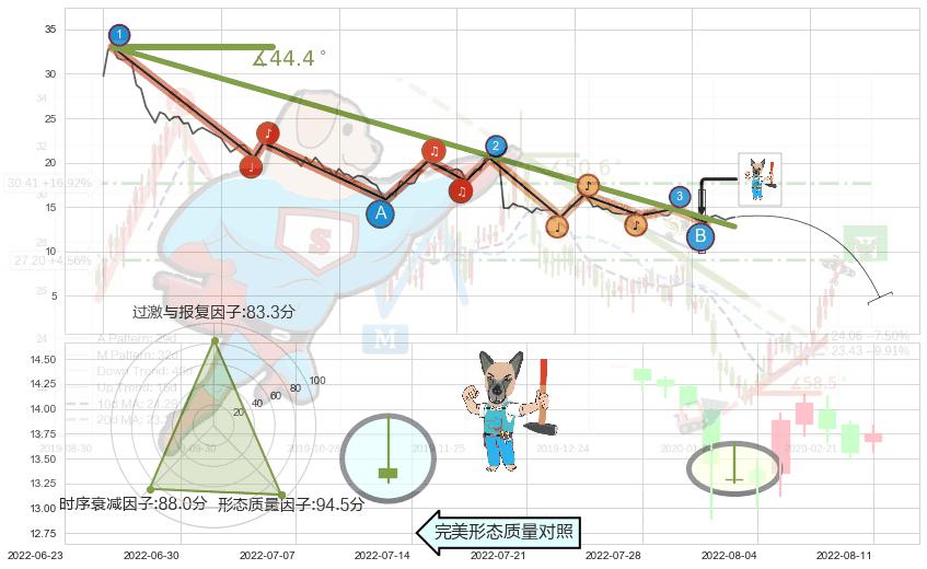 从2022-01-25至2022-08-12,共包含133个交易日,阶段股价下跌-76.54%,阶段股价变动位移路程比: 1 : 4,下跌趋势角度: 44.4,2022-06-06向↘︎形成缺口,跳空下跌-26.24%˚