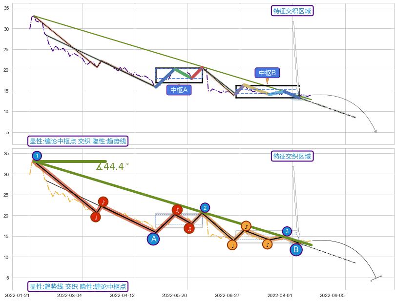 ➣ 缠论中枢点:猜想破位中枢B后持续下拉 → 下跌 → 破位中枢B支撑 → 持续趋势跟踪