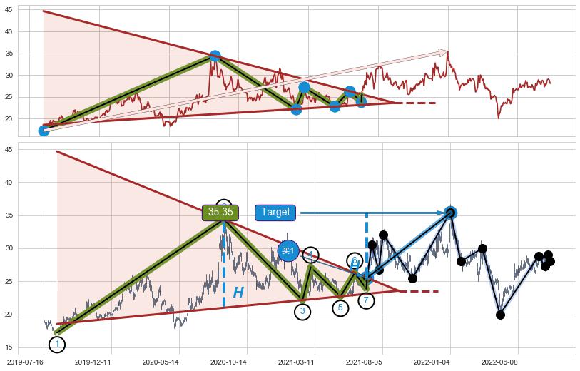 ➢ 最小中继整理涨幅→𝐇: 13.36 (高点逐步降低斜边第一阻力点②与支撑边垂直距离)