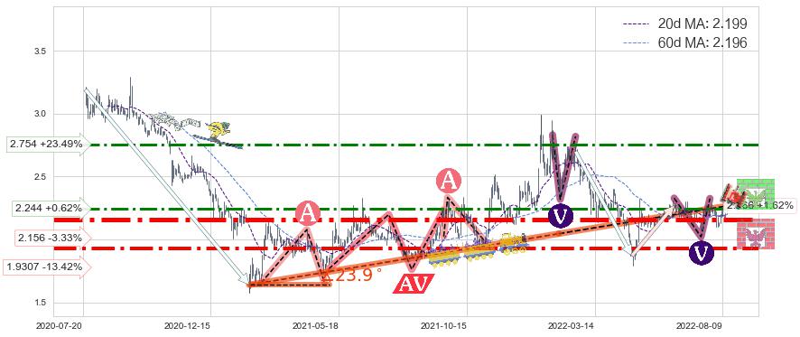 ♘ 阻力价格位2.754,可信任强度57.36%,距离最后交易2022-08-12形成的收盘价格2.230相差 +23.49%