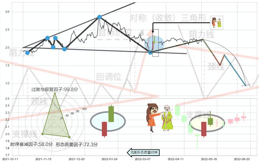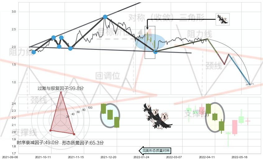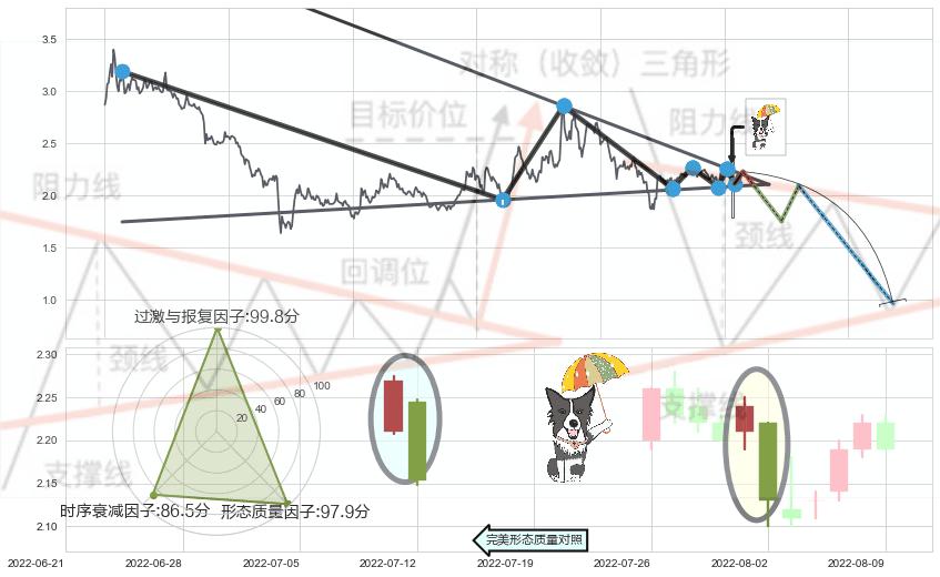 ➣ AI智能: 预测【多空区域上下窄幅震动→价格波动日益狭窄→空方占优】对称三角形中继整理向下突破,预测将在2022-08-03突破颈线, 演变成下降通道