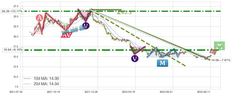 ♘ 阻力价格位16.64,可信任强度88.76%,距离最后交易2022-08-12形成的收盘价格15.25相差 +9.10%