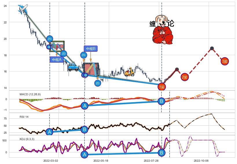 ➣ 缠论买卖点:下降缠中枢AB形成后猜想拐点1买已到达,猜想后续持续拉升(均值回复)