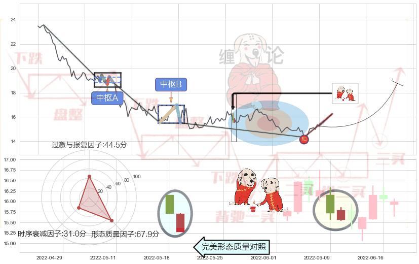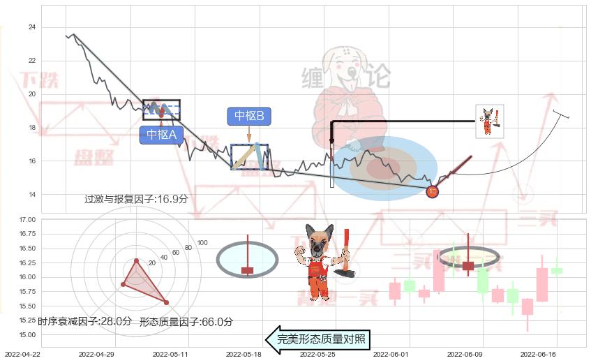 ➣ 【中枢B】:2022-04-11-2022-04-26,中枢由3笔构成,共12交易日, ZG=16.99, ZD=15.53