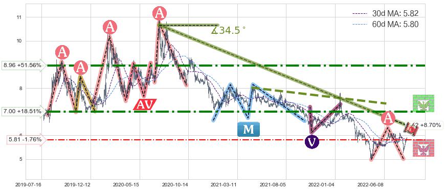 ♘ 阻力价格位7.00,可信任强度84.48%,距离最后交易2022-08-12形成的收盘价格5.91相差 +18.51%