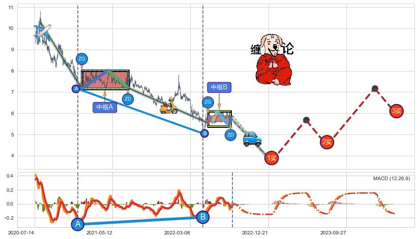 ➢ 【中枢A】:2021-01-11-2021-07-08,中枢由3笔构成,共119交易日, ZG=8.02, ZD=7.20