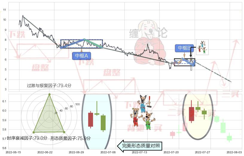 ➣ 【中枢B】:2022-05-17-2022-08-08,中枢由6笔构成,共59交易日, ZG=5.79, ZD=5.58