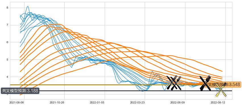 ➣ 34小时均线于(2022-07-14: 3.556)形成【死叉】基于【死叉历史模型】预测死叉后最低波谷价格: 3.262, 死叉后最低价格3.120,已经下跌超出预测最低波谷价格, 预期反弹