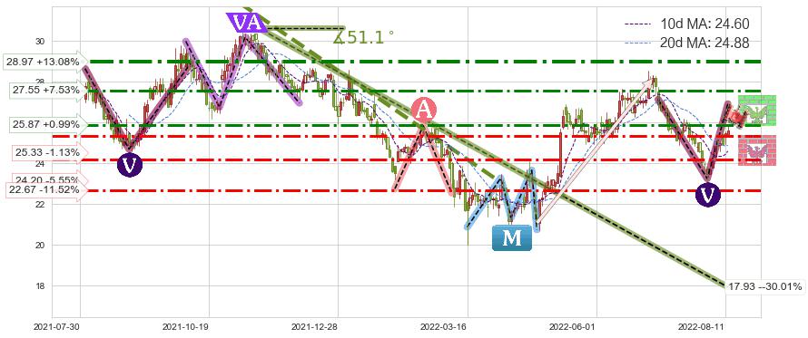 ♘ 阻力价格位25.87,可信任强度67.15%,距离最后交易2022-08-12形成的收盘价格25.62相差 +0.99%