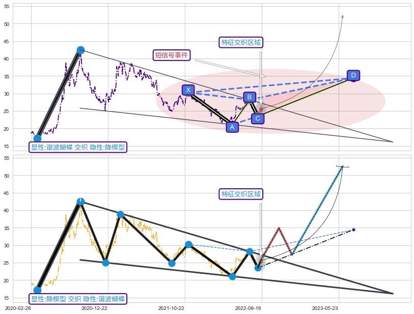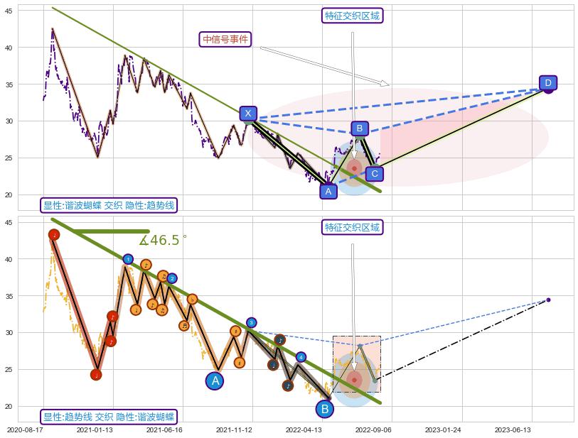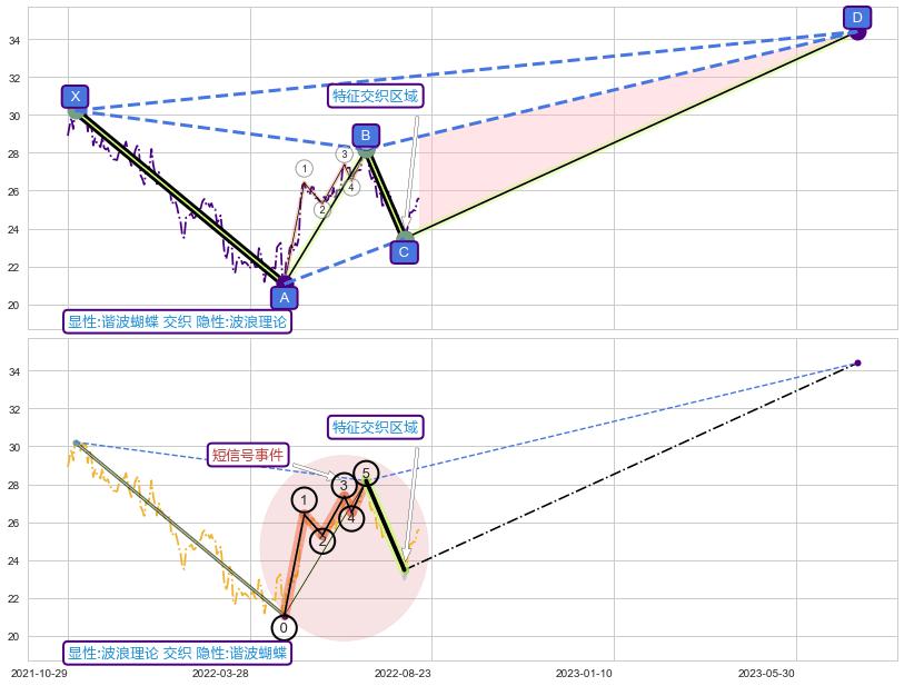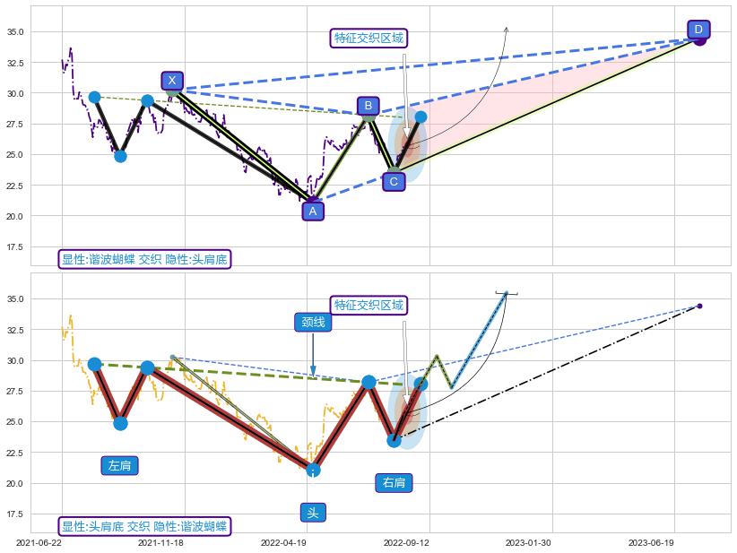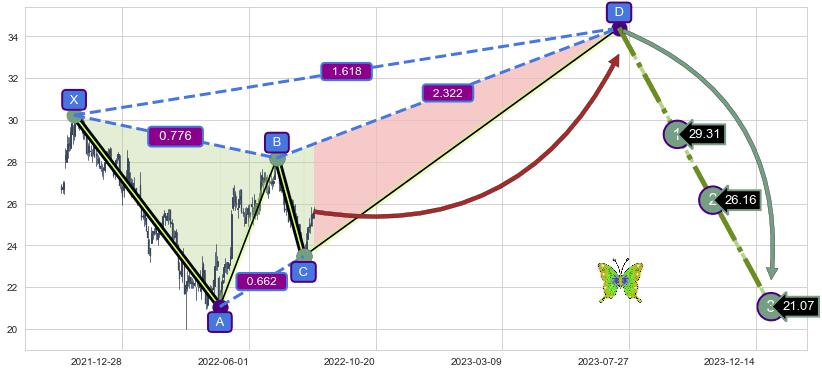 ➣ 未完成【蝴蝶】形态起点X: 2021-11-04, 已到达C点: 2022-08-02, 预测最终D点: 2023-07-17, 共431交易日