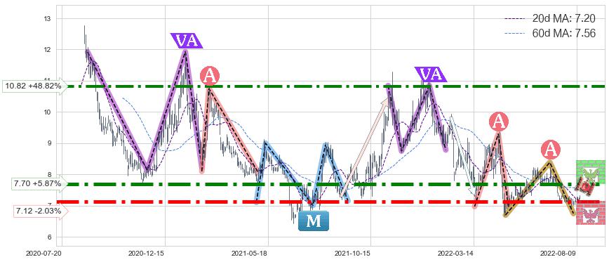 ♘ 阻力价格位10.82,可信任强度78.77%,距离最后交易2022-08-12形成的收盘价格7.27相差 +48.82%