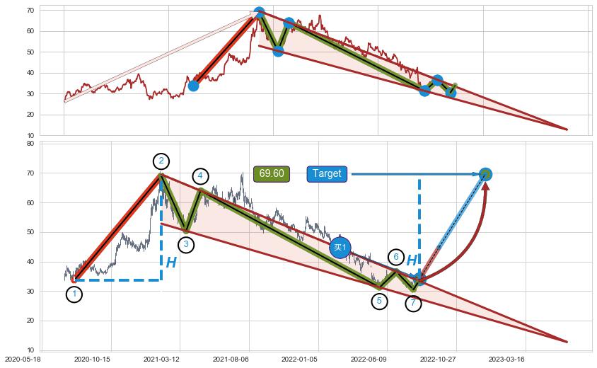 ➢ 降楔型:猜想临近关键阻力位突破点 → 临近拐点上涨 → 机会信号 → 大趋势均值回复