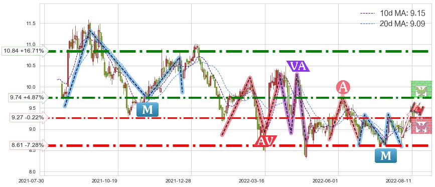 ♘ 阻力价格位9.74,可信任强度84.93%,距离最后交易2022-08-12形成的收盘价格9.29相差 +4.87%