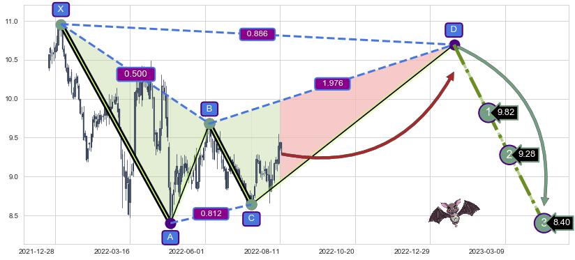 ➣ 未完成【蝙蝠】形态起点X: 2022-01-04, 已到达C点: 2022-07-15, 预测最终D点: 2023-01-20, 共262交易日