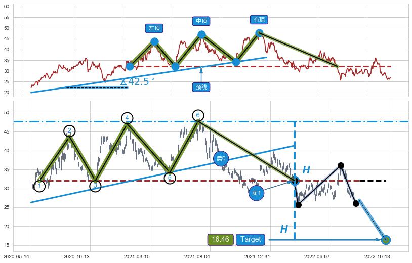 ➣ 三重顶:关键支撑位被击穿 → 猜想形成趋势持续下跌 → 风险信号 → 大趋势均值回复