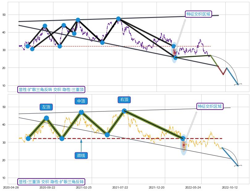 ➣ 扩散三角反转:猜想临近关键支撑位突破点 → 临近拐点下跌 → 风险信号 → 大趋势均值回复