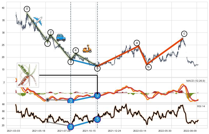 ➣ 第一, 三, 五浪下跌动能逐渐【衰弱变小】,趋势呈现不稳迹象