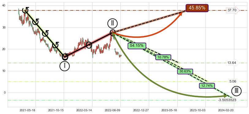 ➢ 看跌(高位倒锤头)流星线 + 波浪理论c点反弹终止反转下跌信号叠加后【反向回撤率】极高,【看空】信号叠加【存续影响极小】
