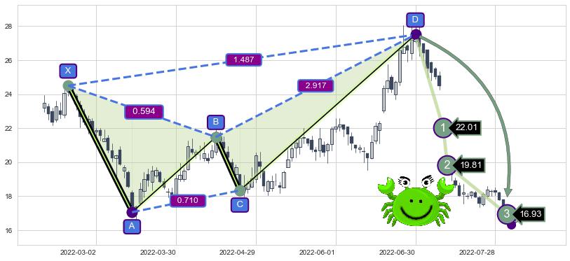 ➣ 谐波螃蟹:d下跌已到达第❸目标:猜想支撑拉升 → 上涨 →【拐点】机会信号 → 大趋势均值回复