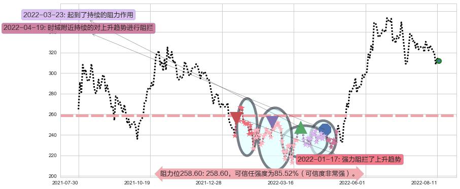 ♘ 支撑价格位258.60,可信任强度85.52%,距离最后交易2022-08-12形成的收盘价格311.93相差 -17.10%