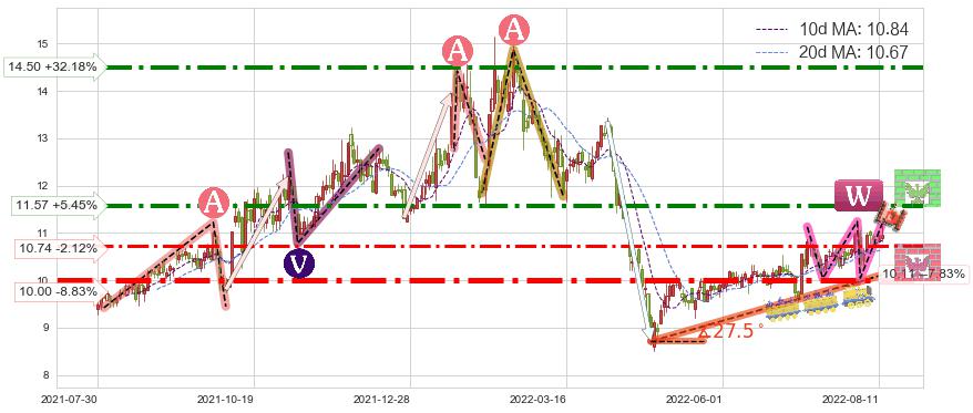 ♘ 阻力价格位14.50,可信任强度74.08%,距离最后交易2022-08-12形成的收盘价格10.97相差 +32.18%