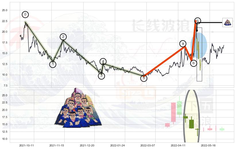 ➣ 波浪理论:猜想达到c点后小反弹终止反转下跌 → 下跌 → 【拐点】临近 → 阶段均值回复结束后继续大周期趋势跟踪