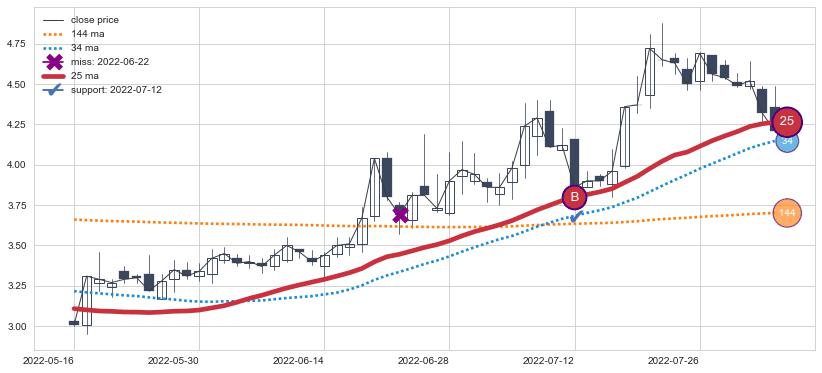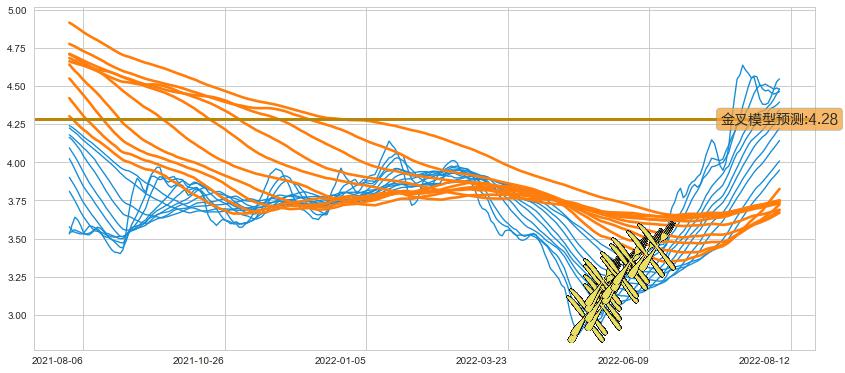 ➣ 80小时均线于(2022-06-13: 3.444)形成【金叉】基于【金叉历史模型】预测金叉后最高波峰价格: 4.81, 金叉后最高价格4.72,虽然还未上涨超出预测最高波峰价格,但横盘时间过长, 预期回调
