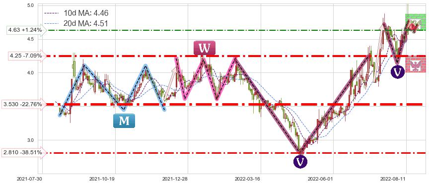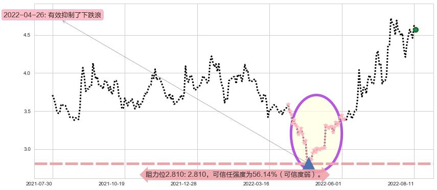 ♘ 阻力价格位4.63,可信任强度52.62%,距离最后交易2022-08-12形成的收盘价格4.57相差 +1.24%