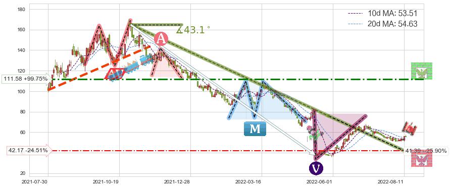♘ 阻力价格位111.58,可信任强度67.30%,距离最后交易2022-08-12形成的收盘价格55.86相差 +99.75%