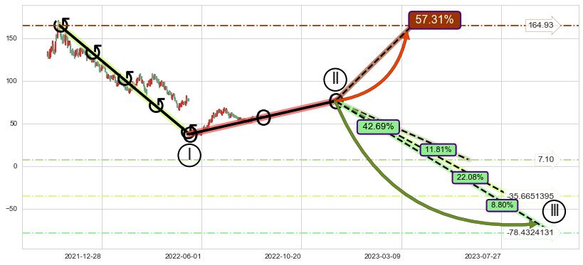 ➣ D点拟合预测价格88.15,距离最后交易收盘价格55.86相差 +57.81%