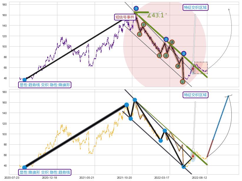 ➢ 趋势线属【短级别信号事件】降旗形属【长级别信号事件】长短周期组合信号事件, 短长事件长度比35.79%