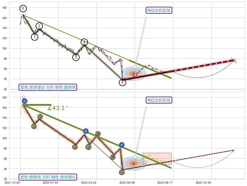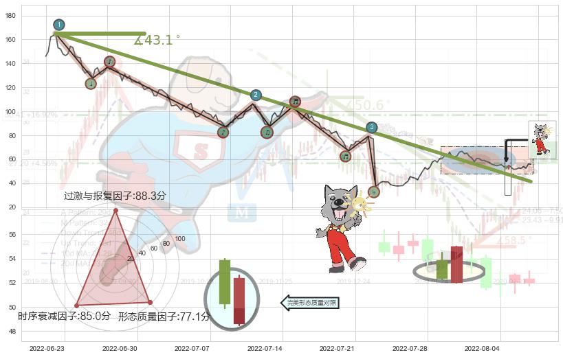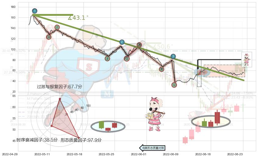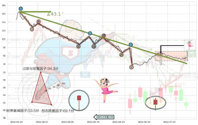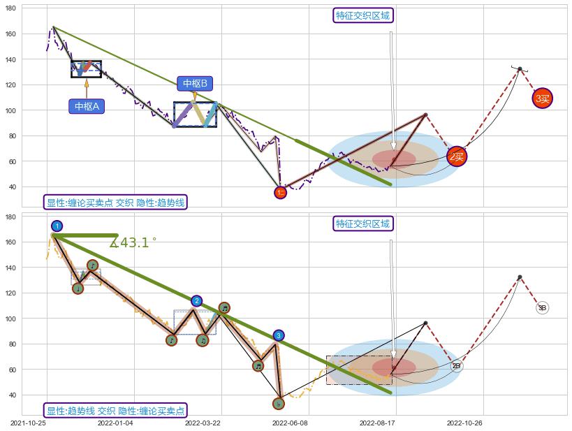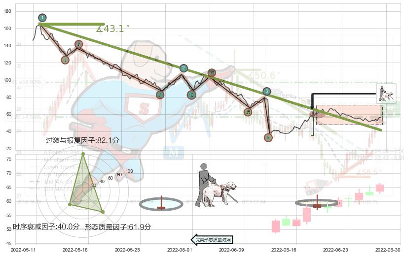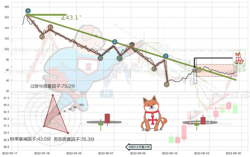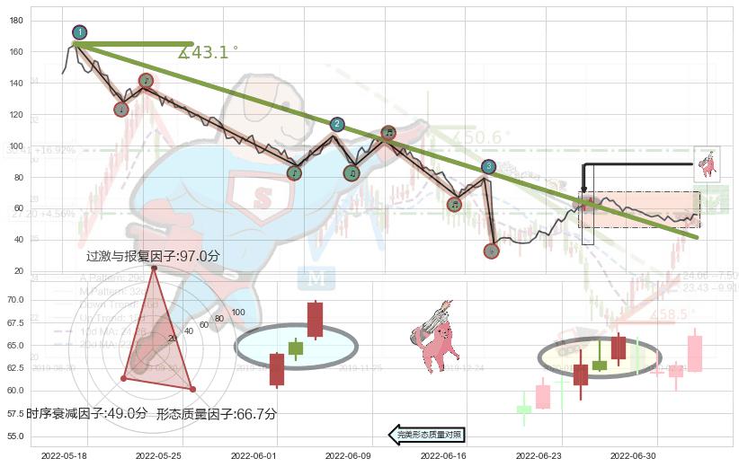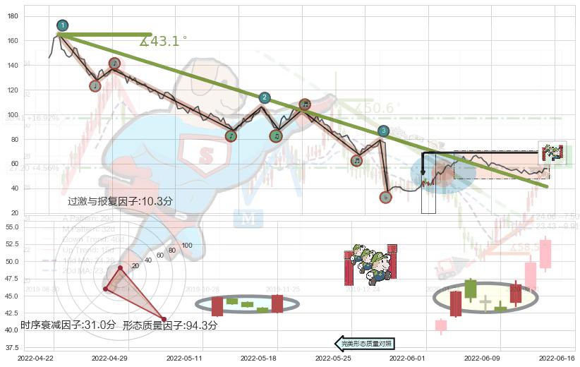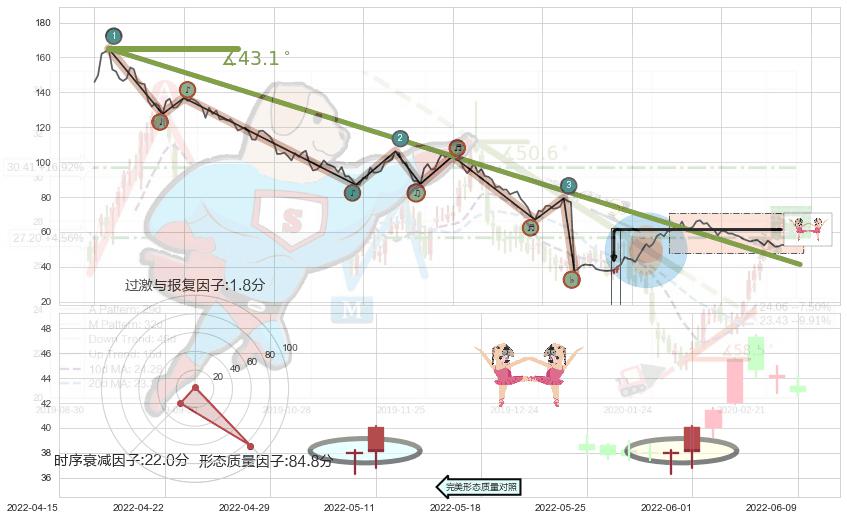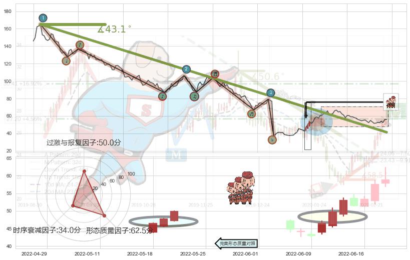 从2021-10-29至2022-05-27,共包含140个交易日,阶段股价下跌-119.69%,阶段股价变动位移路程比: 1 : 3,下跌趋势角度: 43.1,2022-05-16向↘︎形成缺口,跳空下跌-51.36%˚