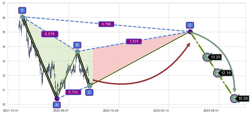 ➣ 谐波伽利:b下跌接近c:猜想支撑性拉升 → 上涨 →【拐点】支撑临近 → 大趋势均值回复