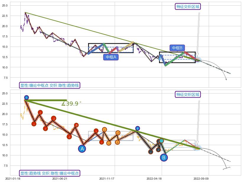 ➢ 缠论中枢点:猜想破位中枢B后持续下拉 → 下跌 → 破位中枢B支撑 → 持续趋势跟踪