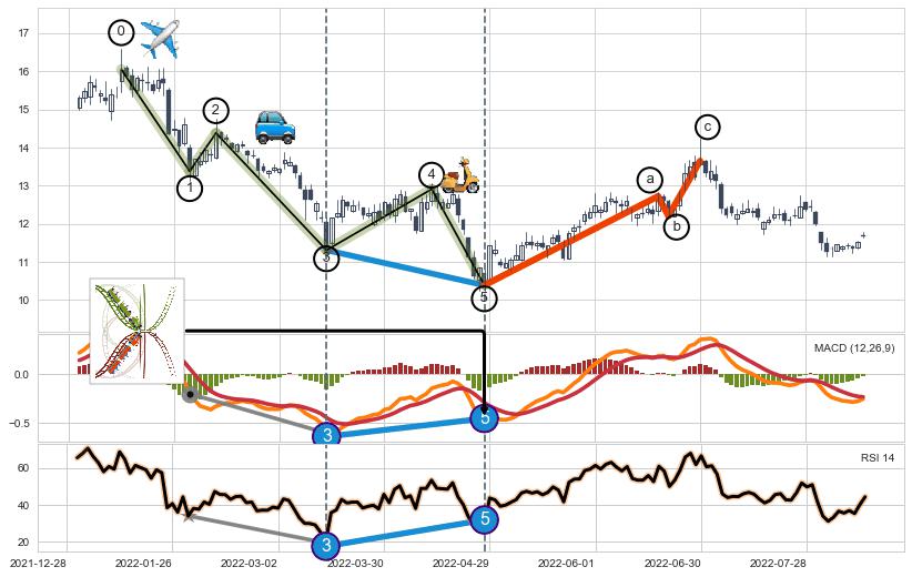 ➣ 第一, 三, 五浪下跌动能逐渐【衰弱变小】,趋势呈现不稳迹象
