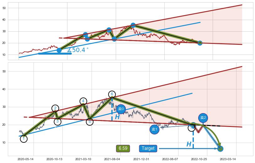 ➢ 最小反转跌幅→𝐇: 13.17 (逐步抬高阻力斜边最后的阻力点⑥与支撑边垂直距离)