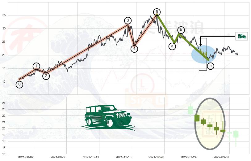 ➢ 波浪理论:猜想击穿破位c点后继续下跌 → 下跌 → 风险信号 → 小趋势跟踪